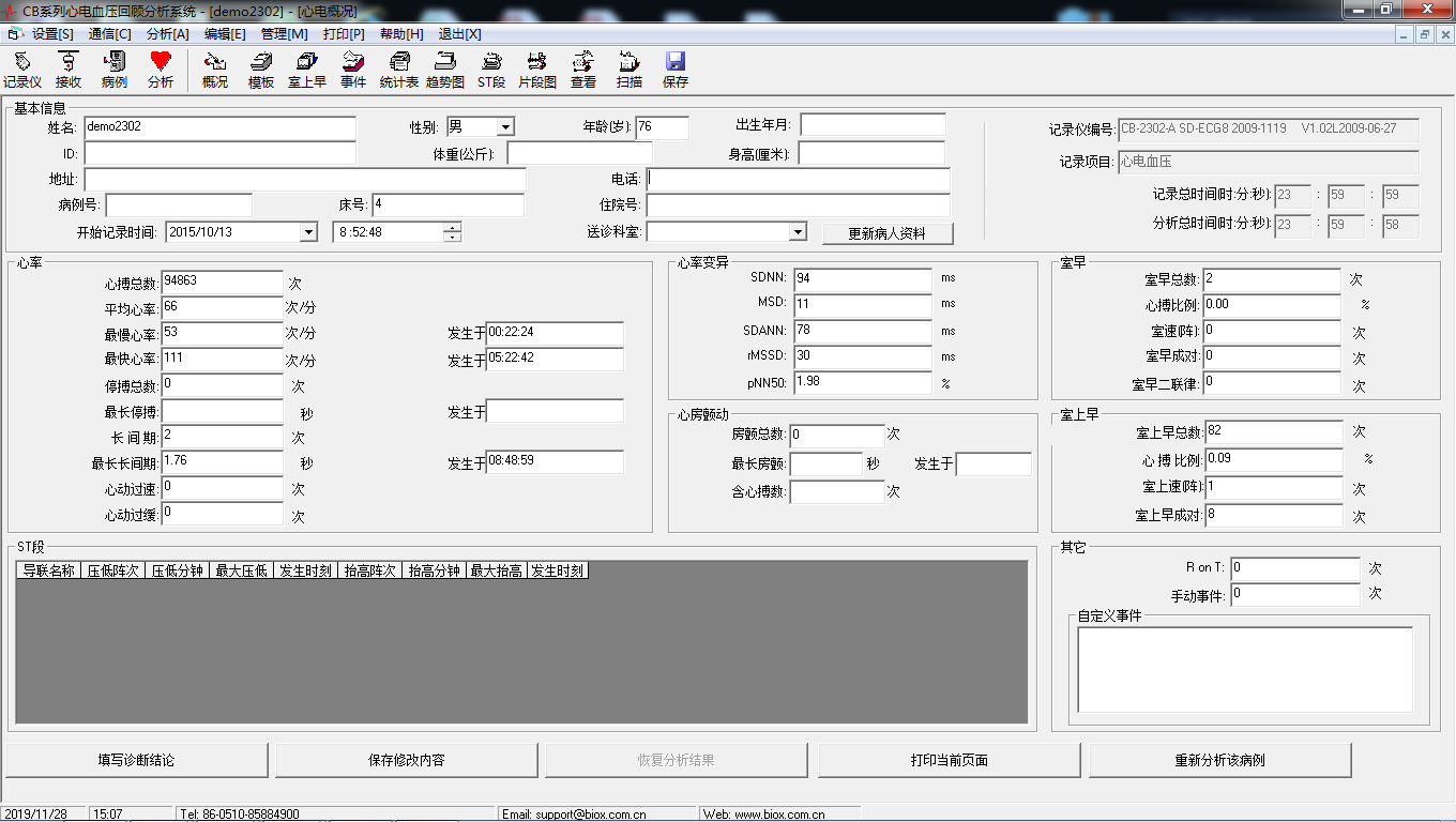 分析功能全面:心律失常分析、ST段分析,起搏分析、心率變異分析,QTc分析,睡眠呼吸分析。